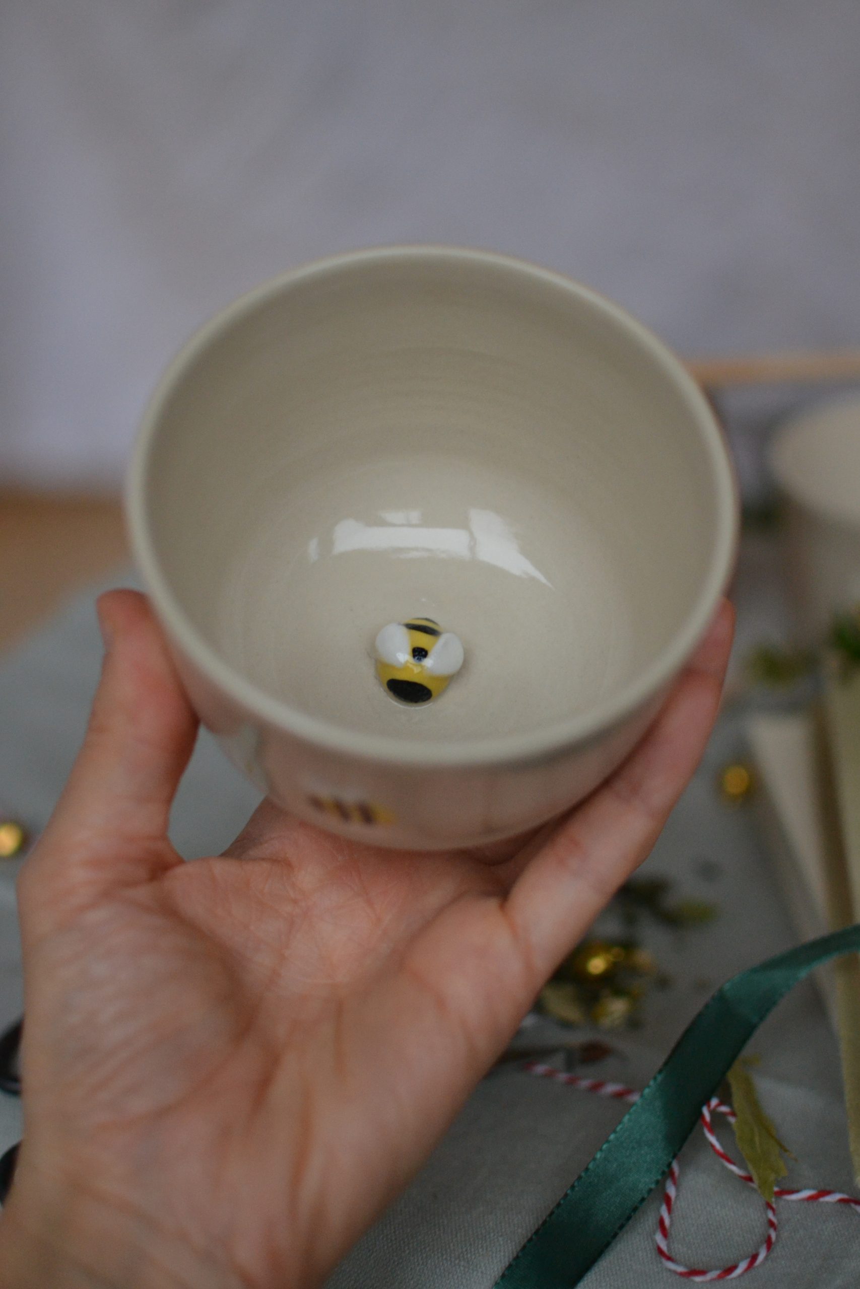 Compatible lave vaisselle et micro onde ; émaillée ; une abeille peinte à l’extérieur et une abeille en relief au fond de la tasse.